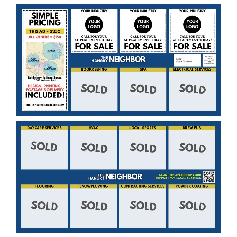 Most magazines place similar businesses next to each other. The Hangry Neighbor features one business per industry on a large postcard mailed directly to local homes. No competition and no pages to flip through!